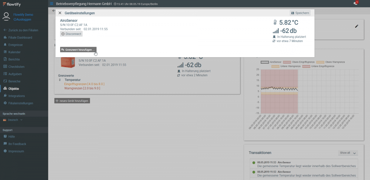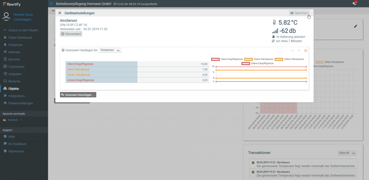 Temperatur Grenzwerte dienen dazu, einen bestimmten Temperaturbereich festzulegen, welcher als akzeptabel für die aktuelle Messung scheint. Wird dieser Wert über- oder unterschritten, werden die Zuständigen benachrichtigt.